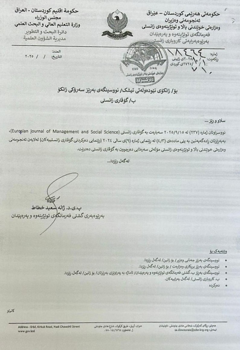 The Eurasian Journal of Management & Social Sciences (EJMSS) has been officially recognized as a scientific journal by the Ministry of Higher Education and Scientific Research in the Kurdistan Region. This significant achievement represents a major milestone for the Faculty of Administrative Sciences and Economics at Tishk International University, underscoring its commitment to advancing academic excellence and fostering impactful research.