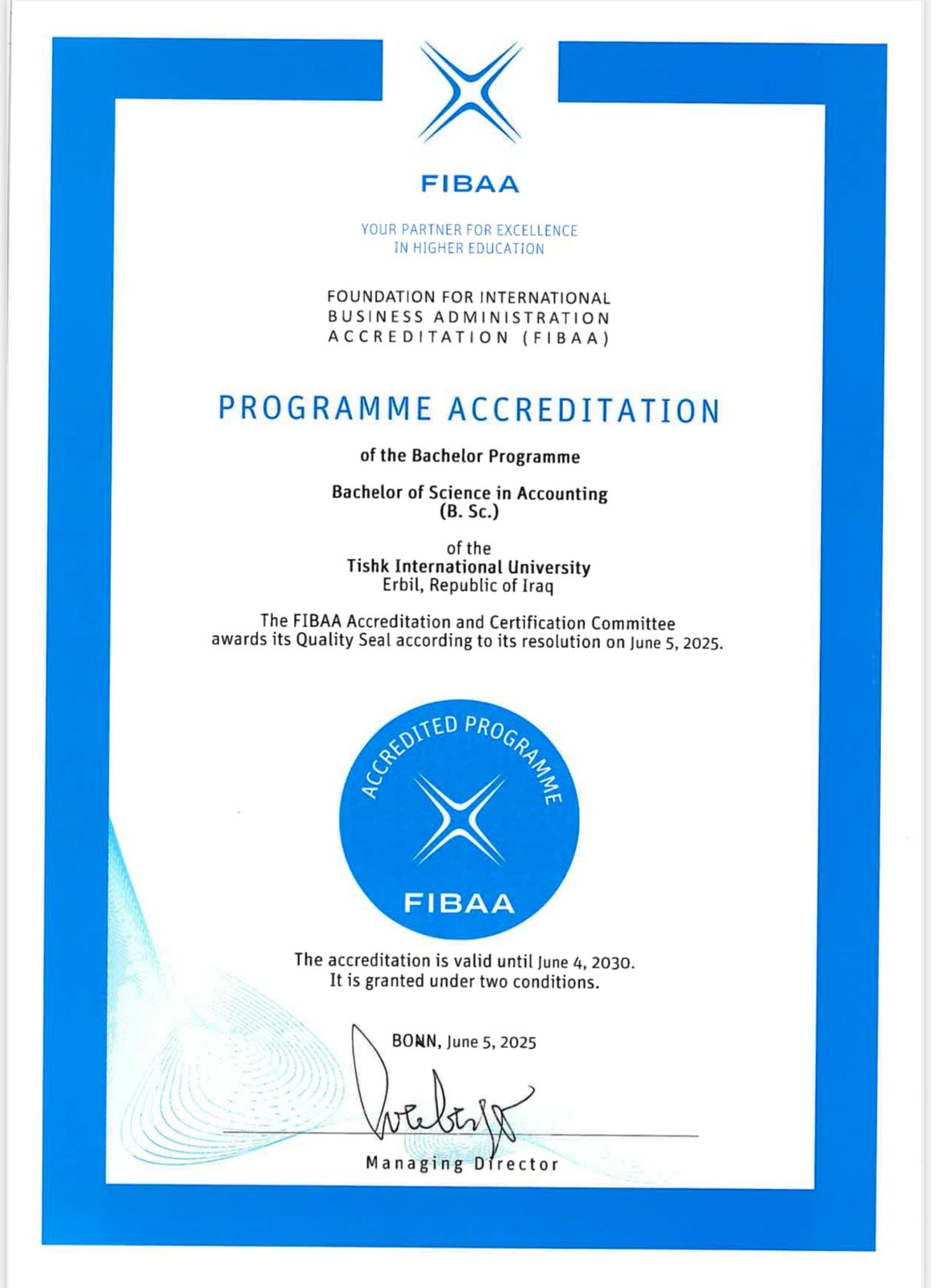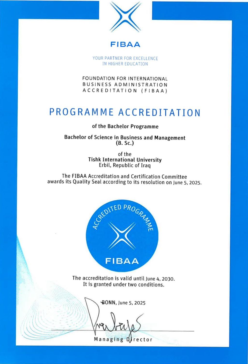 The Faculty of Administrative Sciences and Economics (FASE) at Tishk International University (TIU) is proud to announce that the FIBAA Accreditation and Certification Committee has officially granted accreditation to two of its undergraduate programs: