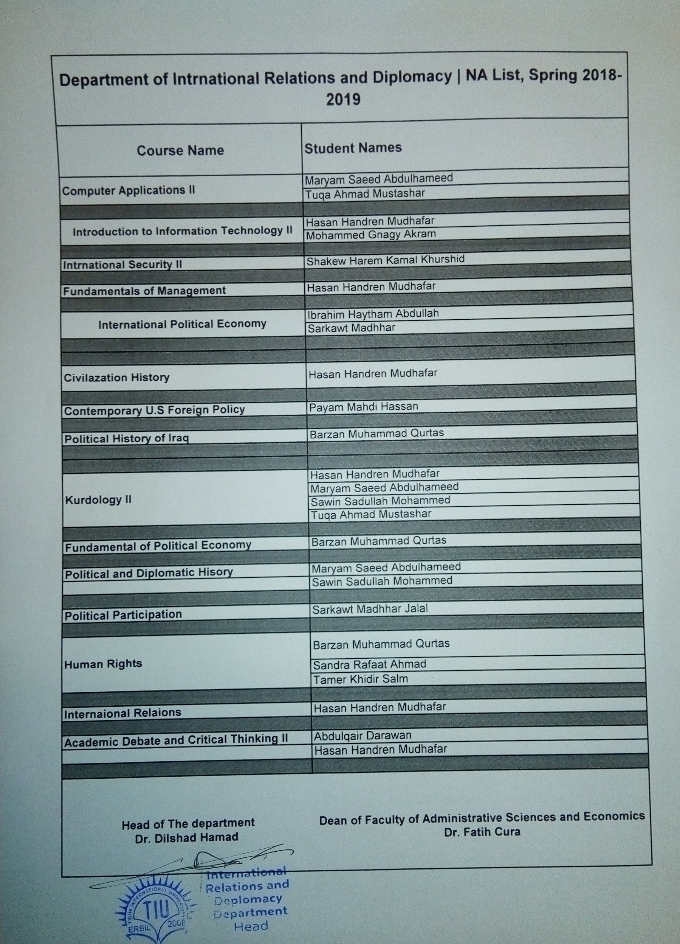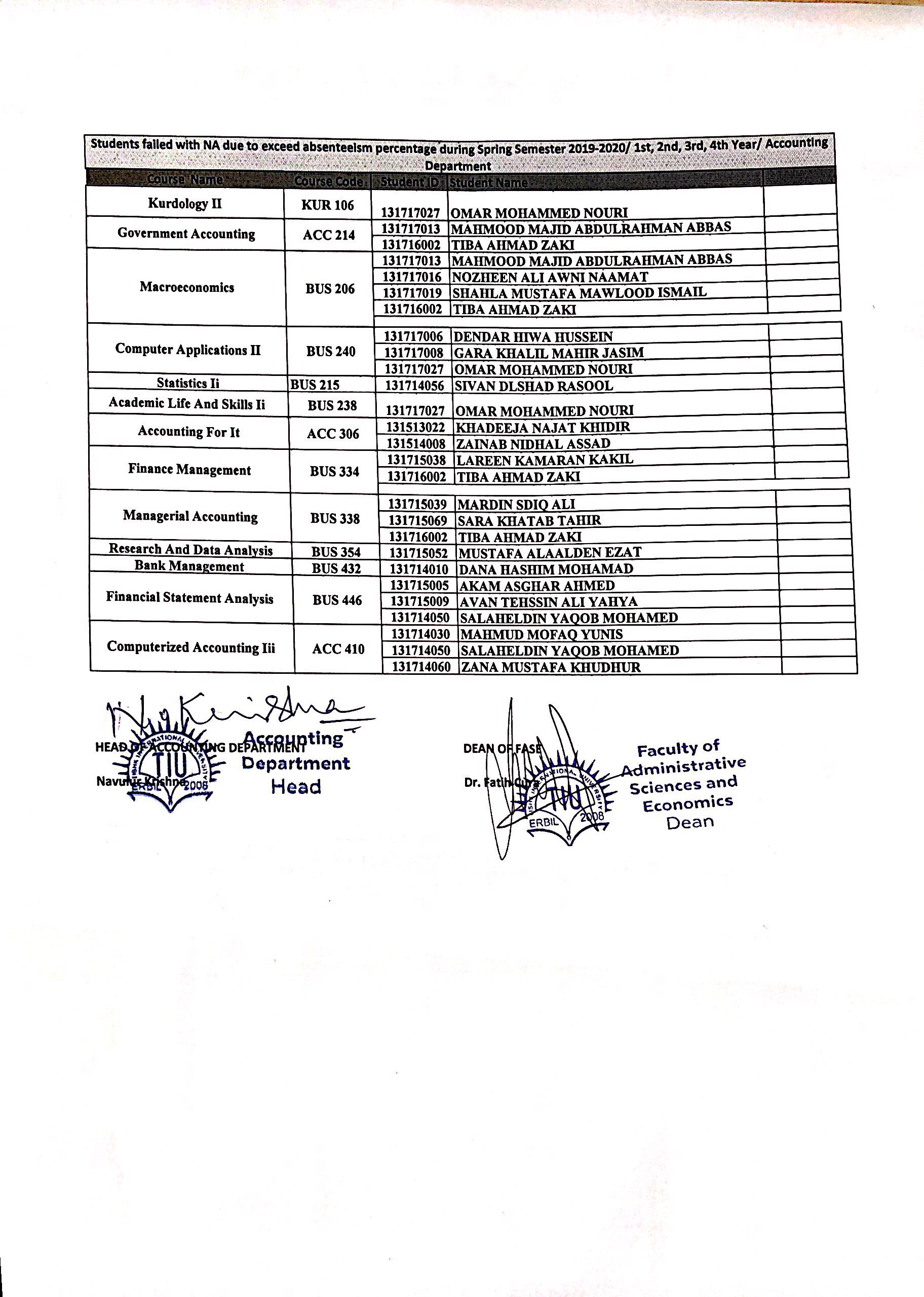 Faculty of Administrative Sciences and Economics announced the list of failed students with NA (Not Attended) due to exceeding absenteeism percentage during Spring Semester for Academic Years 2018-2019.