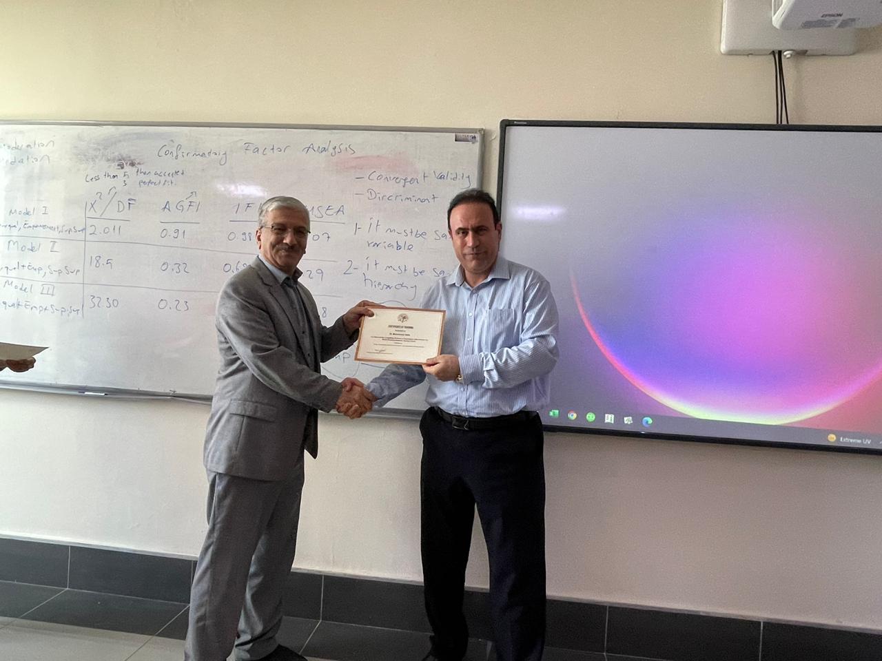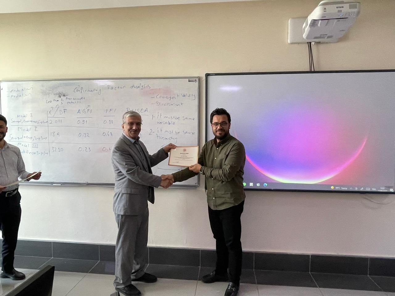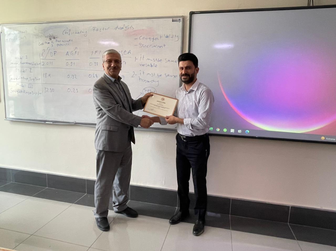 Purpose: This training program aimed to help academicians and researchers learn the basics and advanced statistical data analysis techniques. The training’s first part (A) covered the basics of quantitative data analysis using SPSS (Statistical Package of the Social Science). The second part (B) covered the advanced techniques for multivariate data analysis and sophisticated models for decision-making and forecasting using AMOS.