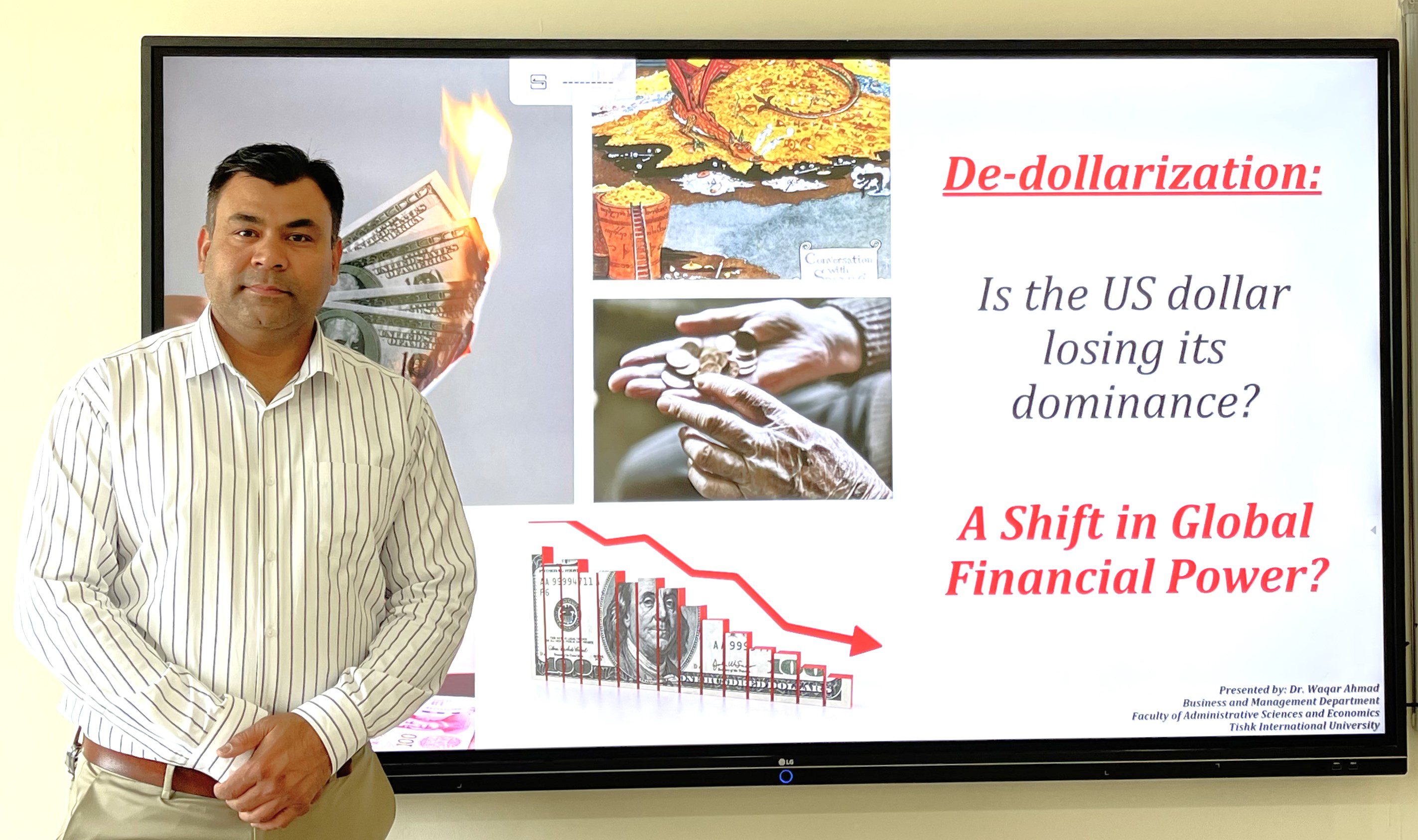 The Department of Business and Management, Faculty of Administrative Sciences and Economics, Tishk International University, Erbil, recently hosted a compelling seminar titled “De-dollarization: Is the US dollar losing its dominance? A Shift in Global Financial Power?” The insightful session was led by Dr. Waqar Ahmad, a distinguished presenter from the same department.