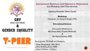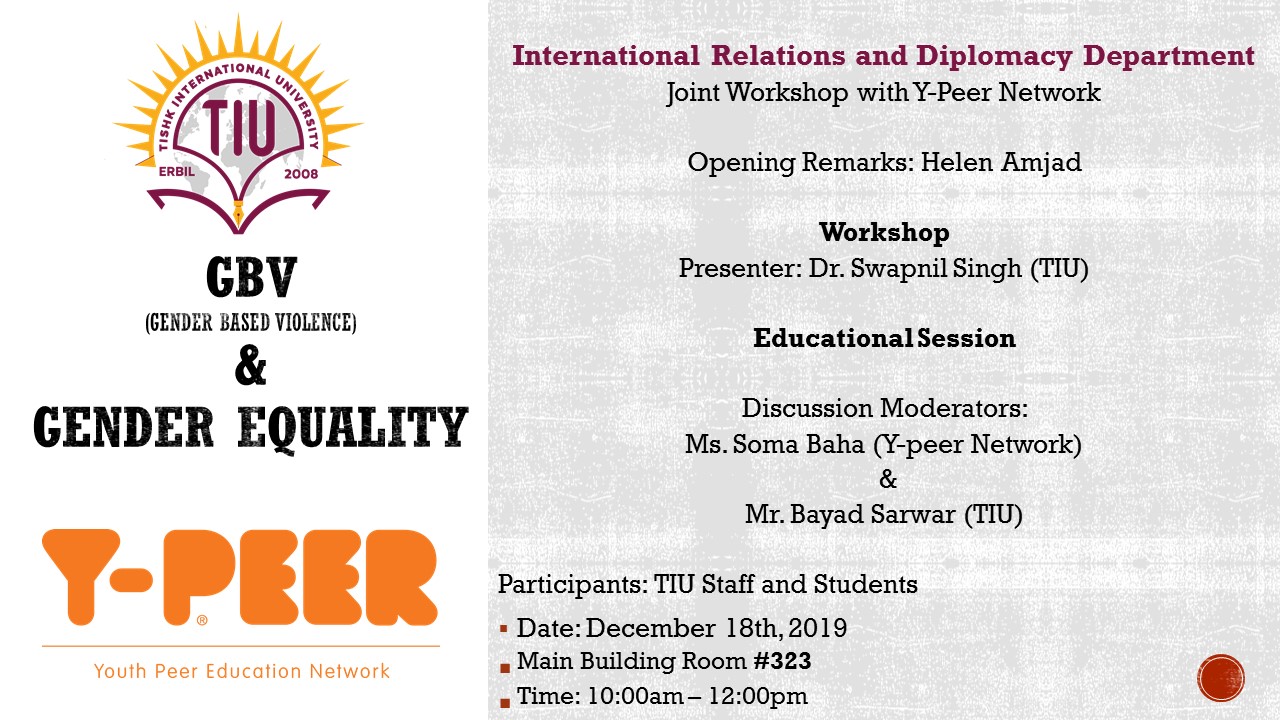 International Relations and Diplomacy department in collaboration with Y-Peer Network will organize a joint workshop entitled ‘ GBV and Gender Equality‘. The workshop will be held on December 18.2019 which coincides with 40th anniversary of the adaptation of Convention on the Elimination of All Forms of Discrimination against Women (CEDAW) back in 1979. Details of the workshop are given below: