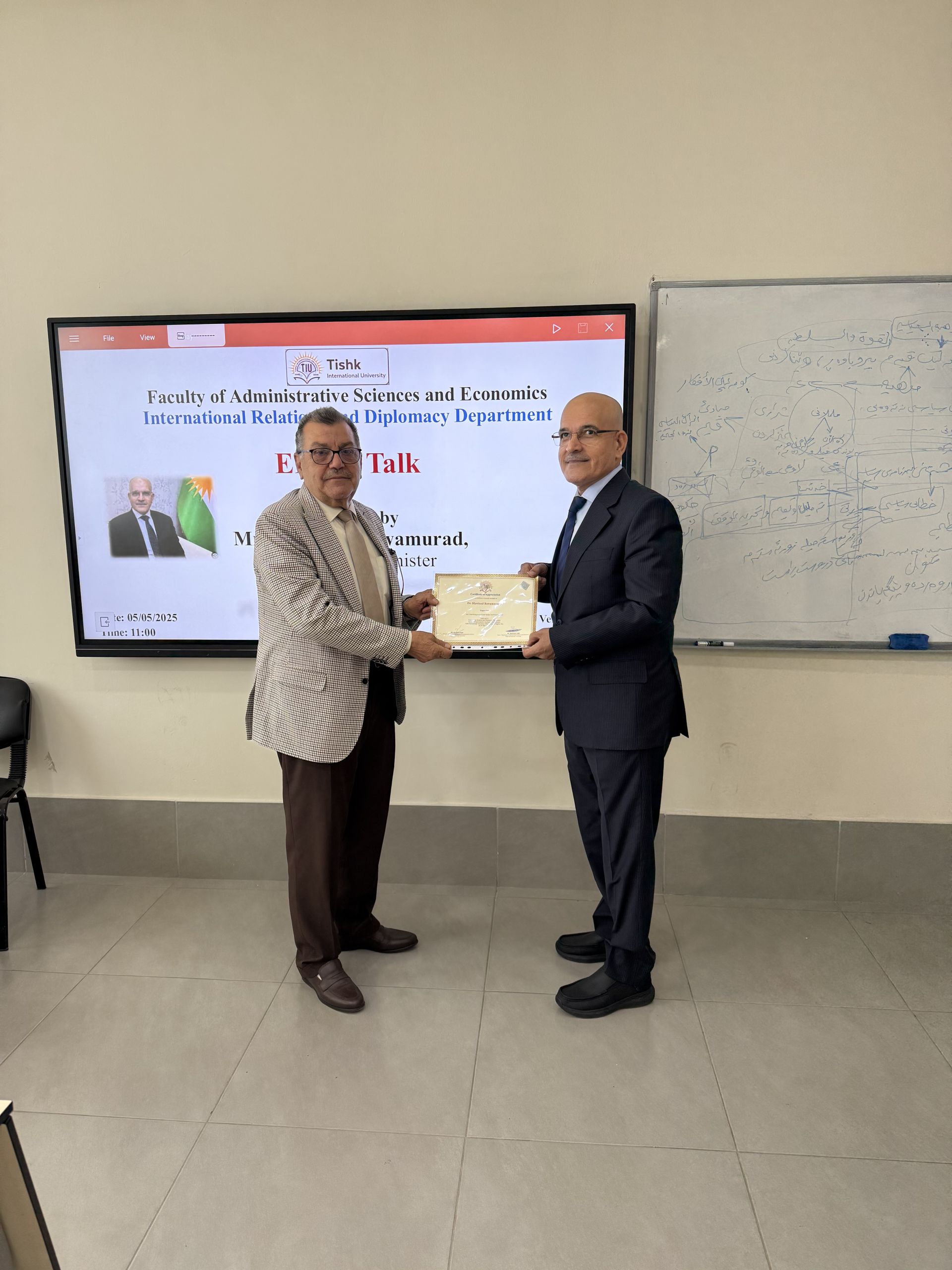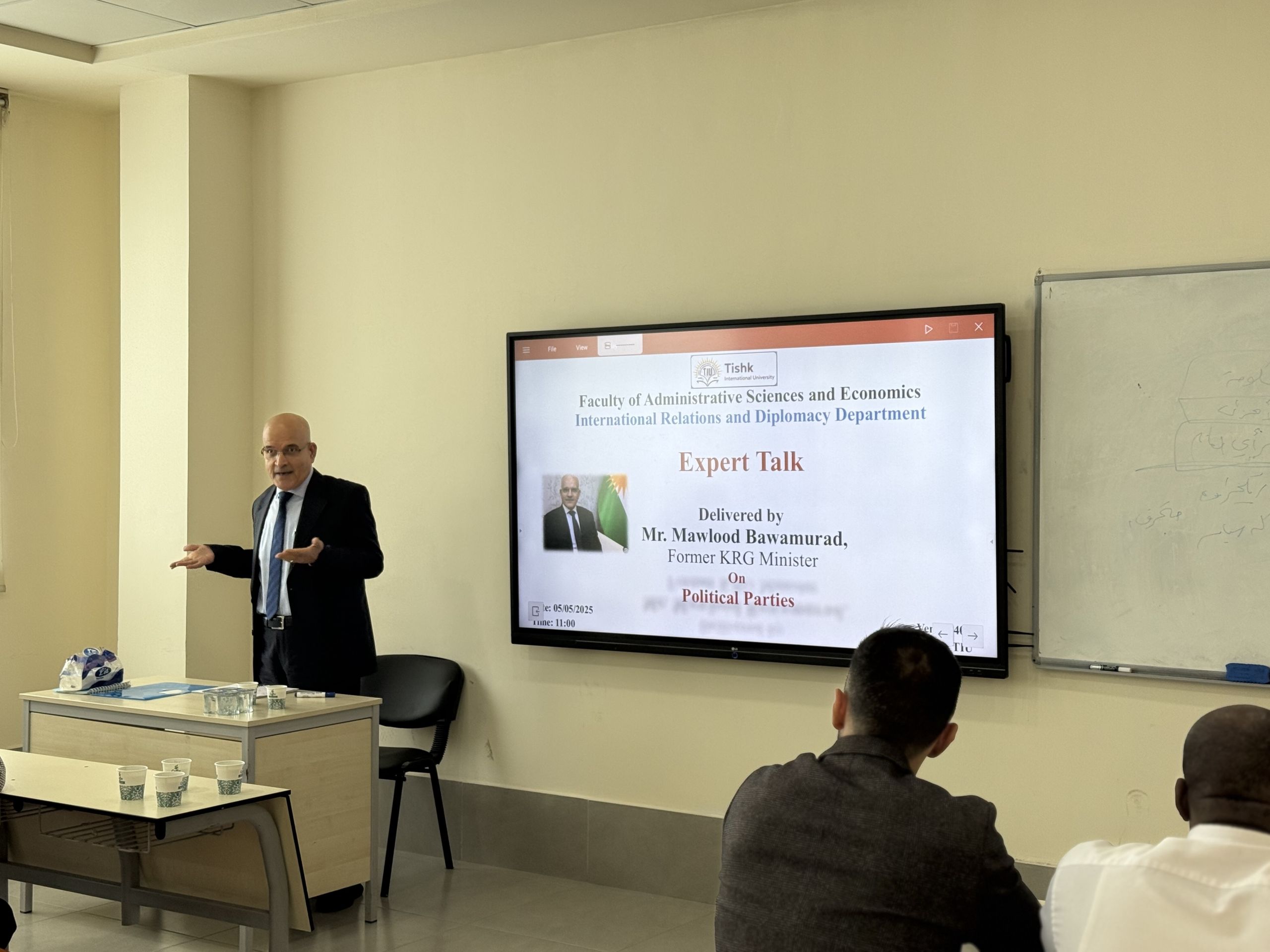 On May 5, 2025, the International Relations and Diplomacy Department at Tishk International University held an insightful “Expert Talk on Political Parties.” The event featured a distinguished guest speaker, Dr. Mawlood Bawamurad, a former Minister in the Kurdistan Regional Government. The talk began with opening remarks by Dr. Mohammad Salih Mustafa, Head of the International Relations and Diplomacy Department, who welcomed participants and introduced the guest speaker. Dr. Mustafa highlighted the importance of understanding political party structures and ideologies in today’s complex global political landscape.