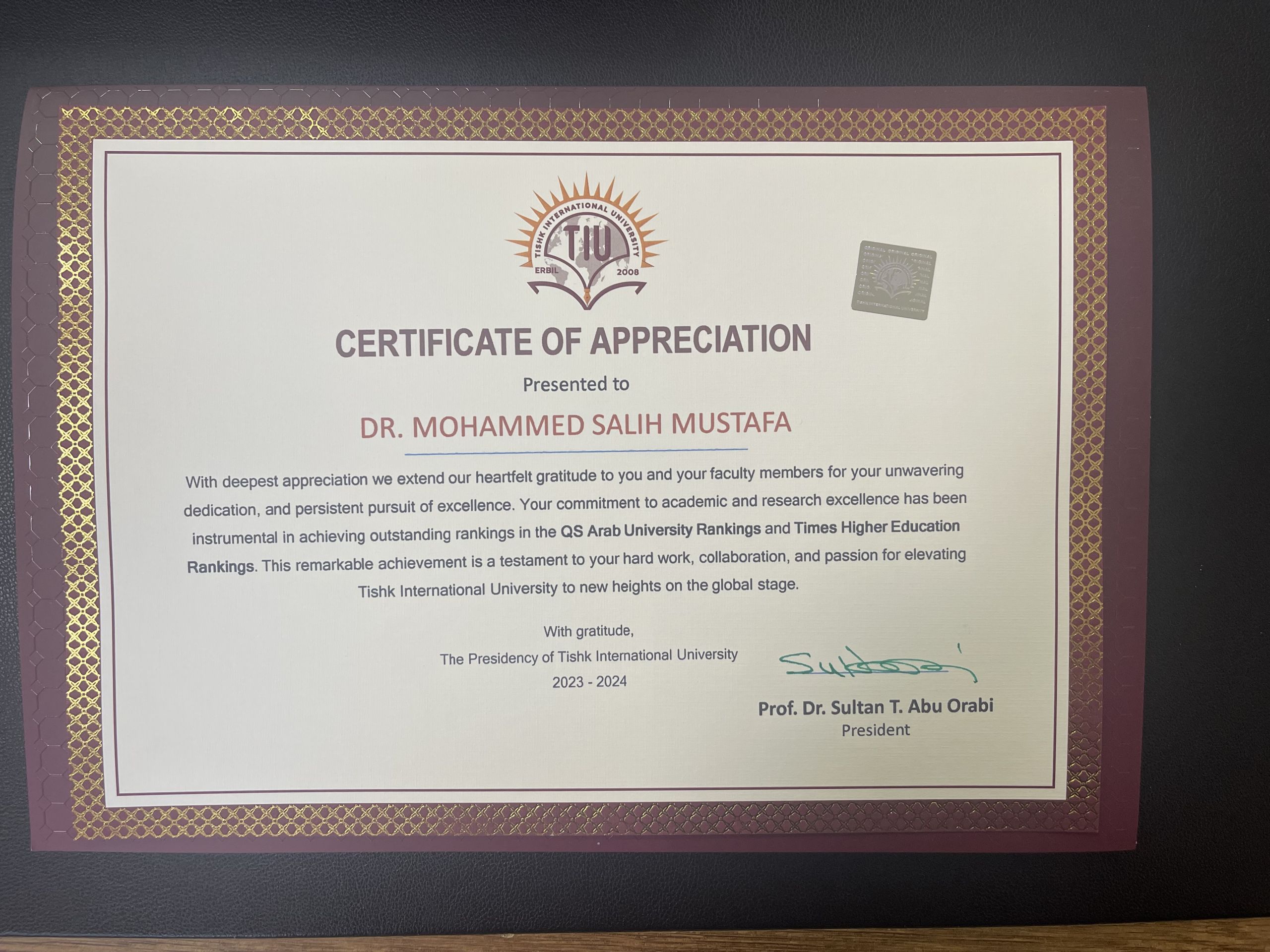 Dr. Mohammad Salih Mustafa, Head of the International Relations and Diplomacy Department, proudly received the certificate of appreciation on behalf of the department. This acknowledgment serves as a testament to the collective hard work and commitment of every member of the IRD team.