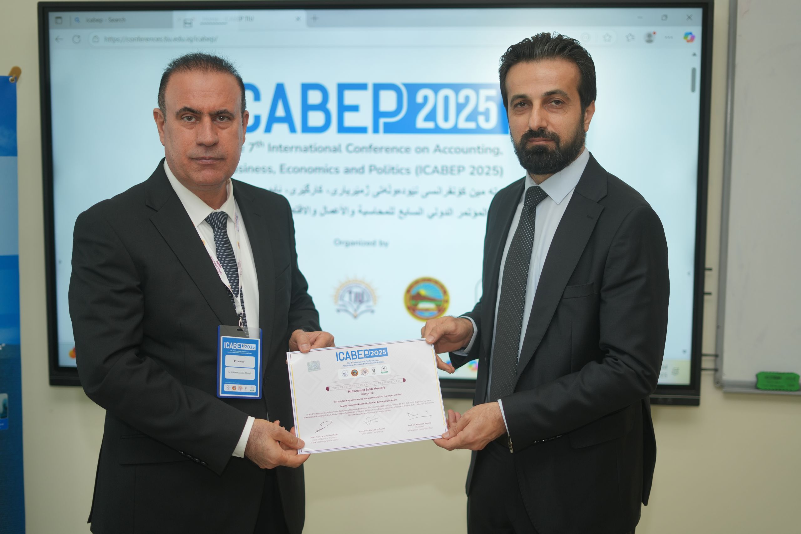 The Faculty of Administrative Sciences and Economics of Tishk International University successfully hosted the 7th International Conference on Accounting, Business, Economics and Politics (ICABEP 2025) at the Pharmacy Building, Hall 400, bringing together a distinguished group of scholars, researchers, and professionals to discuss emerging trends and challenges across the fields of accounting, business, economics, and politics.