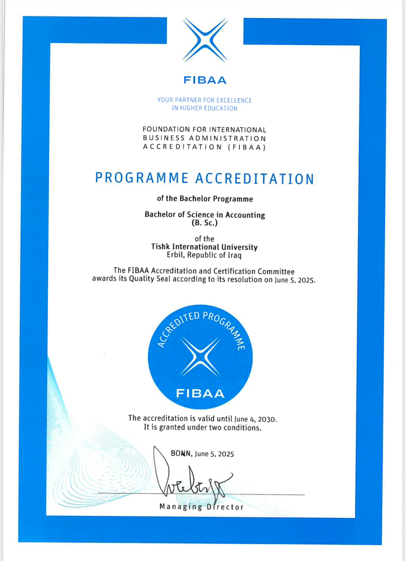 Keywords: Accreditation, FIBAA, Business, Management, Accounting, Academic Excellence, Higher Education, Tishk International University