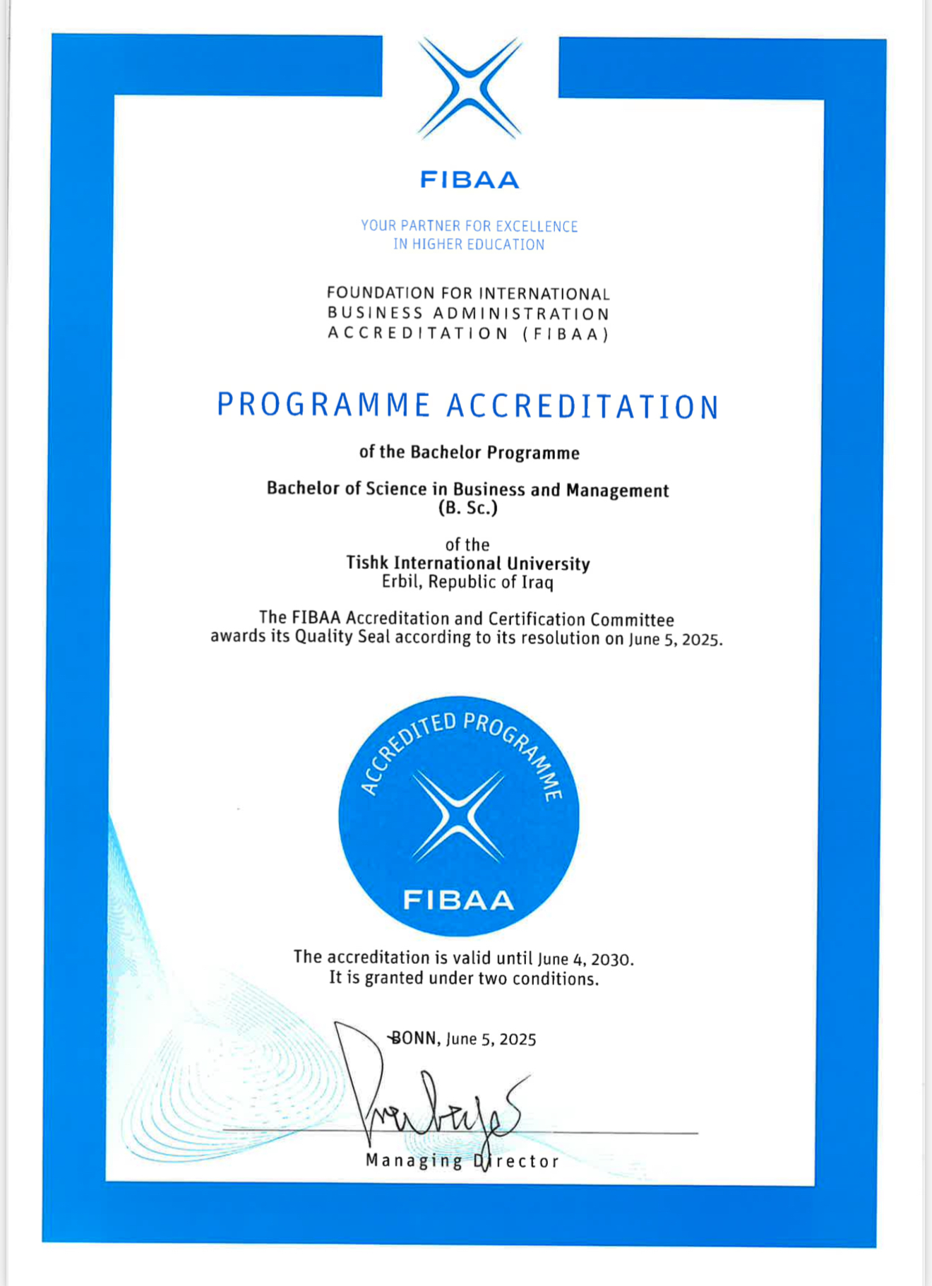 The Faculty of Administrative Sciences and Economics at Tishk International University is pleased to announce that the FIBAA Accreditation and Certification Committee (F-ACC) has officially granted accreditation to the following undergraduate programs:
